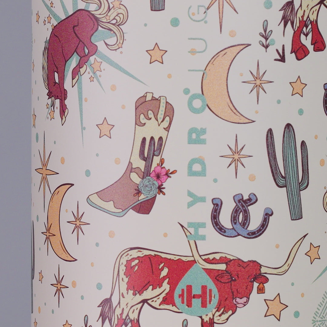 Stay hydrated with the Traveler 20oz in Rodeo. With its cream base accented by desert-inspired graphics, this compact water bottle adds a western touch while supporting steady hydration through school days, commutes, or weekend activities. The 20oz capacity is the most portable option in the Traveler collection ��� small enough for backpacks, lunch bags, and cup holders, yet dependable enough for everyday hydration. Built from durable stainless steel with triple-wall insulation, the Rodeo tumbler keeps drinks cold for hours, and its dishwasher-safe construction makes cleanup easy. Designed for convenience, it���s completely leakproof with the straw down, equipped with a hygienic circular flip straw for smooth sipping, and includes a removable silicone boot to protect both the insulated bottle and the surfaces you place it on. Reliable and versatile, it���s hydration made for kids, adults, and anyone who needs a durable grab-and-go option. Dimensions: 3.35" x 4.78" x 7.62" Base diameter: 2.76" Capacity: 20 ounces of water ~ 592 mL Weight: 14.72oz