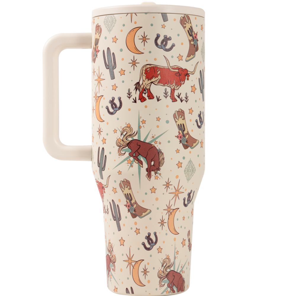 Stay hydrated throughout the day with the Traveler 40oz in Rodeo. Featuring a western-inspired pattern, this water bottle adds a unique touch while helping you keep water close at hand during workouts, commutes, or long days at the office. Made from durable stainless steel with triple-wall insulation, the Rodeo tumbler keeps drinks cold for hours and is designed to support consistent hydration. Its 40oz capacity reduces the need for frequent refills, making it easier to stay on track with your wellness goals. For everyday convenience, it���s completely leakproof with the straw down, equipped with a flip-straw lid for smooth sipping, and built with a cupholder-friendly base. The ergonomic handle ensures easy carrying, and the dishwasher-safe design makes cleanup simple. The Traveler 40oz combines durability, capacity, and everyday performance, giving you a dependable insulated water bottle that supports hydration and wellness wherever life takes you. Dimensions: 3.9" x 6" x 9.84" Base diameter: 3.04" Capacity: 40 ounces of water ~ 1183 mL Weight: 20oz